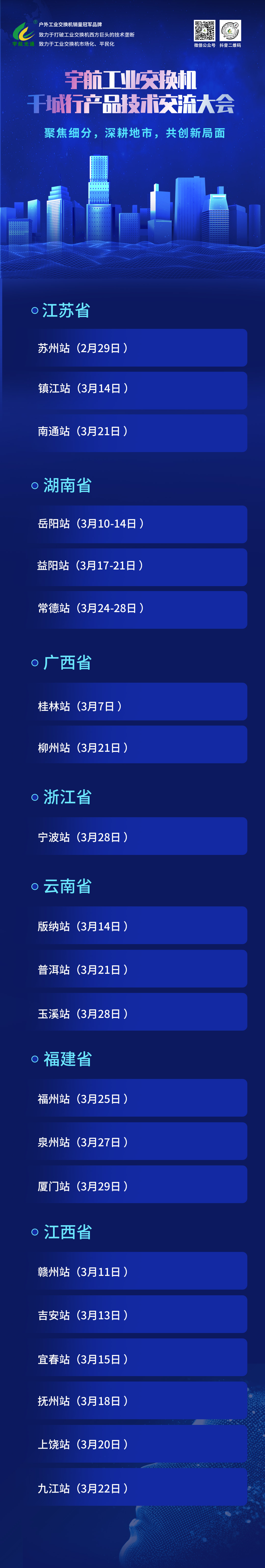 三月,宇航將攜手眾多合作伙伴和宇航全國產(chǎn)工業(yè)交換機(jī),在濟(jì)南、西安、鄭州、合肥、武漢等地參展,與各界朋友共襄盛舉。同時,宇航還將深入江蘇、湖南、廣西、浙江、云南、福建、江西等地,舉行宇航工業(yè)交換機(jī)千城行產(chǎn)品技術(shù)交流大會,助力各行各業(yè)的數(shù)字化轉(zhuǎn)型,讓數(shù)字化轉(zhuǎn)型的春風(fēng),吹滿神州大地!