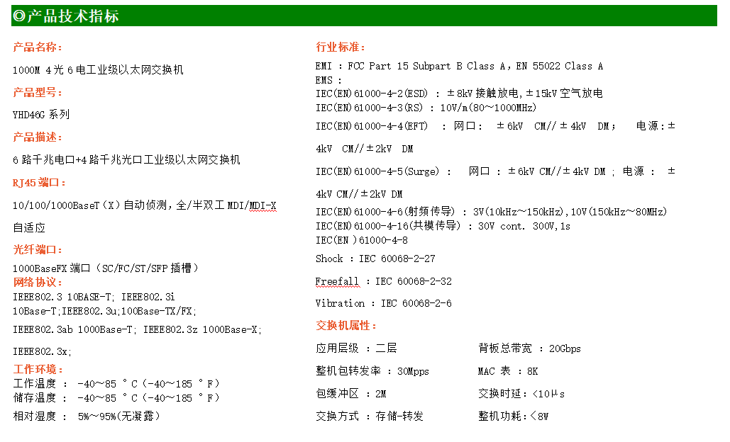 6路千兆電口+4路千兆FX光口工業級以太網交換機,支持6個100Base-T/1000Base-TX電口和4個1000Base-X光口。產品符合FCC、CE、ROHS標準。YH300-46G交換機具有-40℃~85℃的工作溫度,具有超強的堅固度能適應各種嚴苛環境,也可以非常方便的安置在空間緊湊的控制箱中。導軌的安裝特性、寬溫操作及擁有IP40防護等級的外殼及LED指示燈,使YH300-46G成為一個即插即用的工業級設備,為用戶的以太網設備聯網提供可靠、便捷的解決方案。