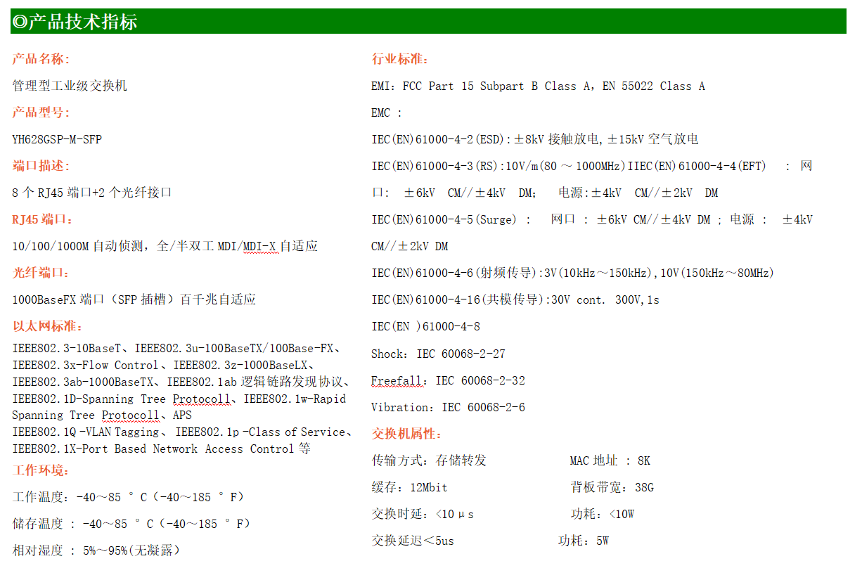 YH600-28GSP-M-SFP是網管型POE工業以太網交換機,產品符合FCC、CE、RoHS標準。支持2個千兆光口和8個千兆poe電口;支持工業現場所需的以太網二層協議,保證通信網絡的穩定性;該系列交換機采用低功耗、無風扇設計,確保無噪聲干擾,同時支持-40~85℃工作溫度和良好的EMC電磁兼容性能,保證在惡劣的工業環境中保持穩定的工作,為工廠自動化,智能交通,視頻監控等工業應用領域組建快速穩定的網絡終端接入網絡提供安全可靠的解決方案。