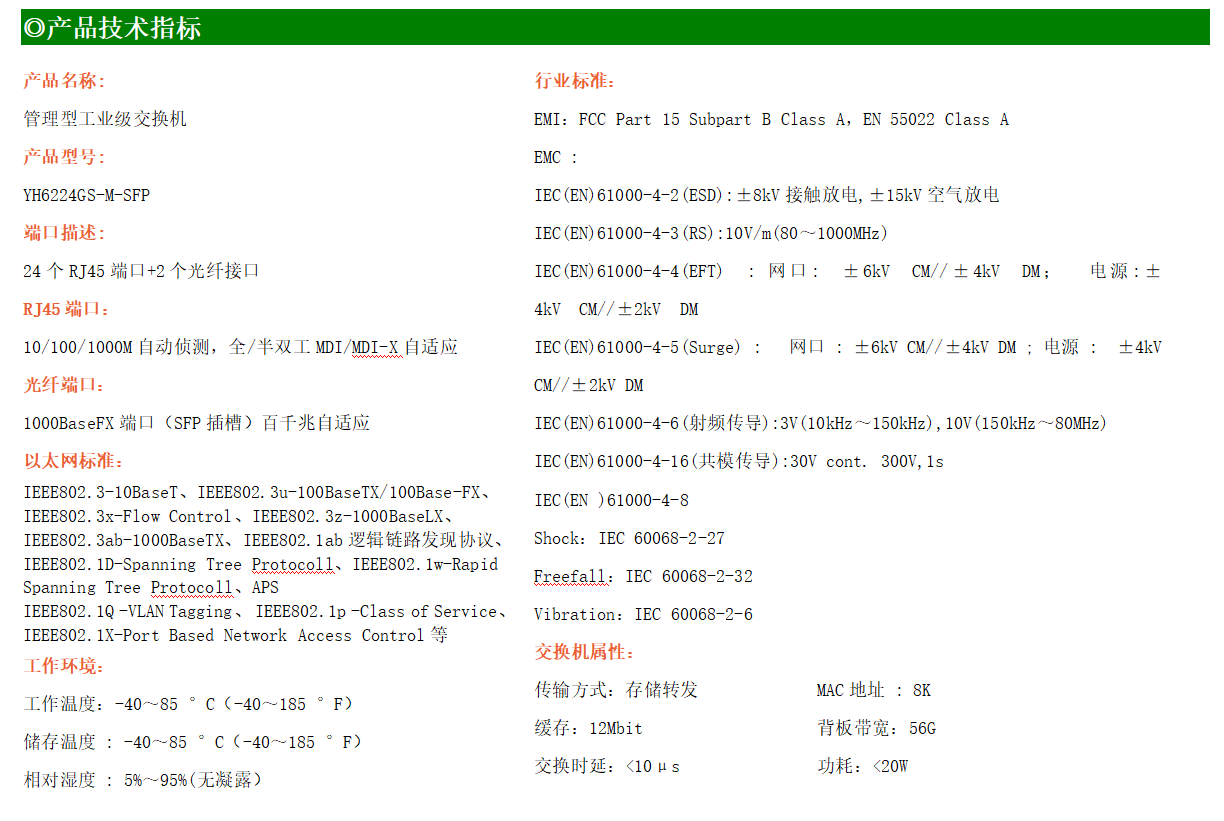 YH600-224GS-M-SFP是網(wǎng)管型工業(yè)以太網(wǎng)交換機(jī),產(chǎn)品符合FCC、CE、RoHS標(biāo)準(zhǔn)。支持2個(gè)千兆光口和24個(gè)千兆電口;支持工業(yè)現(xiàn)場(chǎng)所需的以太網(wǎng)二層協(xié)議,保證通信網(wǎng)絡(luò)的穩(wěn)定性;該系列交換機(jī)采用低功耗、無(wú)風(fēng)扇設(shè)計(jì),確保無(wú)噪聲干擾,同時(shí)支持-40~85℃工作溫度和良好的EMC電磁兼容性能,保證在惡劣的工業(yè)環(huán)境中保持穩(wěn)定的工作,為工廠自動(dòng)化,智能交通,視頻監(jiān)控等工業(yè)應(yīng)用領(lǐng)域組建快速穩(wěn)定的網(wǎng)絡(luò)終端接入網(wǎng)絡(luò)提供安全可靠的解決方案。
