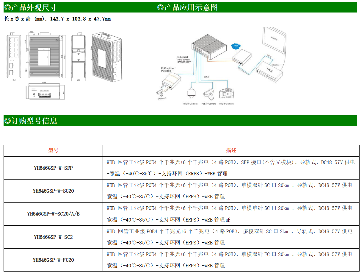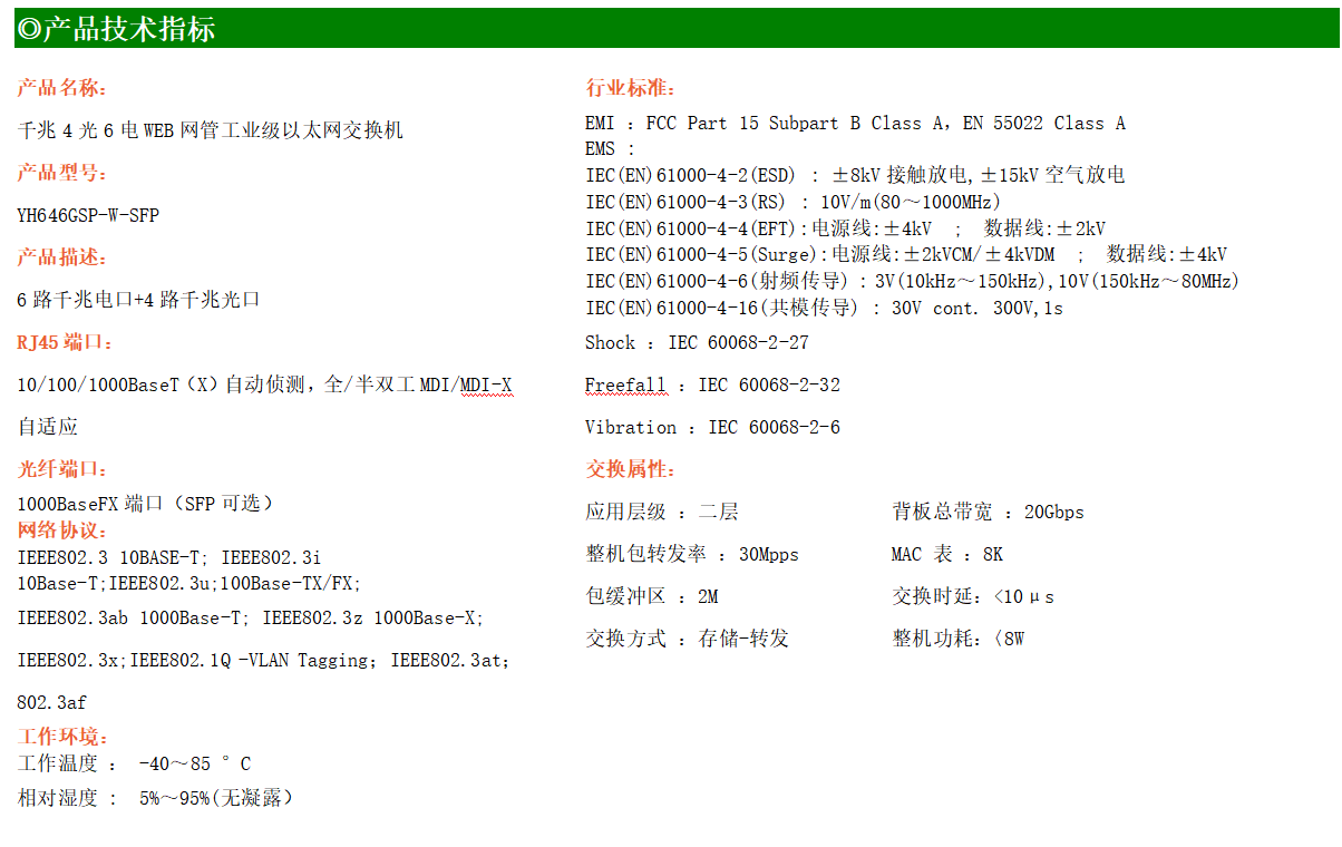 YH600-46GSP-W-SFP系列WEB管理工業級以太網PoE交換機,產品符合FCC、CE、ROHS標準,支持工業現場所需的以太網二層協議,保證通信網絡的穩定性。該系列交換機采用低功耗、無風扇設計,確保無噪聲干擾,同時支持-40~85℃工作溫度和良好的EMC電磁兼容性能,保證在惡劣的工業環境中保持穩定的工作,為工廠自動化,智能交通,視頻監控等工業應用領域組建快速穩定的網絡終端接入網絡提供安全可靠的解決方案。