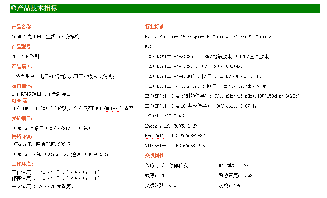 1路百兆POE電口+1路百兆光口工業級以太網POE交換機,支持1個10/100Base-TX電口和1個100Base-X(SC/ST/FC)光口。產品符合FCC、CE、ROHS標準。RDL11FP系列交換機具有-40℃~75℃的工作溫度,具有超強的堅固度能適應各種嚴苛環境,也可以非常方便的安置在空間緊湊的控制箱中。導軌的安裝特性、寬溫操作及擁有IP40防護等級的外殼及LED指示燈,使RDL11FP成為一個即插即用的工業級設備,為用戶的以太網設備聯網提供可靠、便捷的解決方案。