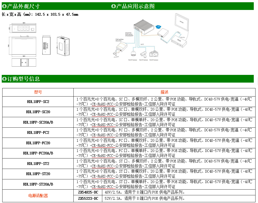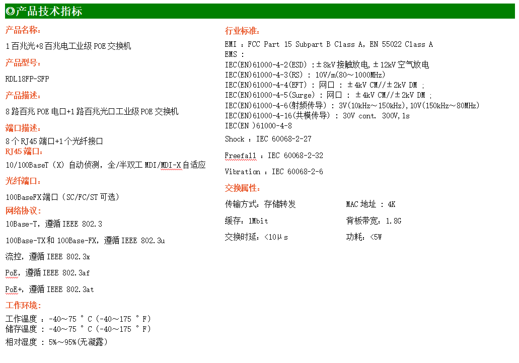 8路百兆POE電口+1路百兆FX光口工業級以太網POE交換機,支持8個10/100Base-TX電口和1個100Base-X光口。產品符合FCC、CE、ROHS標準。RDL18FP交換機具有-40℃~75℃的工作溫度,具有超強的堅固度能適應各種嚴苛環境,也可以非常方便的安置在空間緊湊的控制箱中。導軌的安裝特性、寬溫操作及擁有IP40防護等級的外殼及LED指示燈,使RDL18FP成為一個即插即用的工業級設備,為用戶的以太網設備聯網提供可靠、便捷的解決方案。
