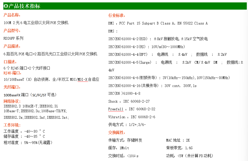6路百兆POE電口+2路百兆FX光口工業(yè)級以太網(wǎng)交換機(jī),支持6個10Base-T/100Base-TX電口和2個100Base-X光口。產(chǎn)品符合FCC、CE、ROHS標(biāo)準(zhǔn)。RD26FP系列交換機(jī)具有-40℃~80℃的工作溫度,具有超強(qiáng)的堅固度能適應(yīng)各種嚴(yán)苛環(huán)境,也可以非常方便的安置在空間緊湊的控制箱中。導(dǎo)軌的安裝特性、寬溫操作及擁有IP40防護(hù)等級的外殼及LED指示燈,使RD26FP成為一個即插即用的工業(yè)級設(shè)備,為用戶的以太網(wǎng)設(shè)備聯(lián)網(wǎng)提供可靠、便捷的解決方案。