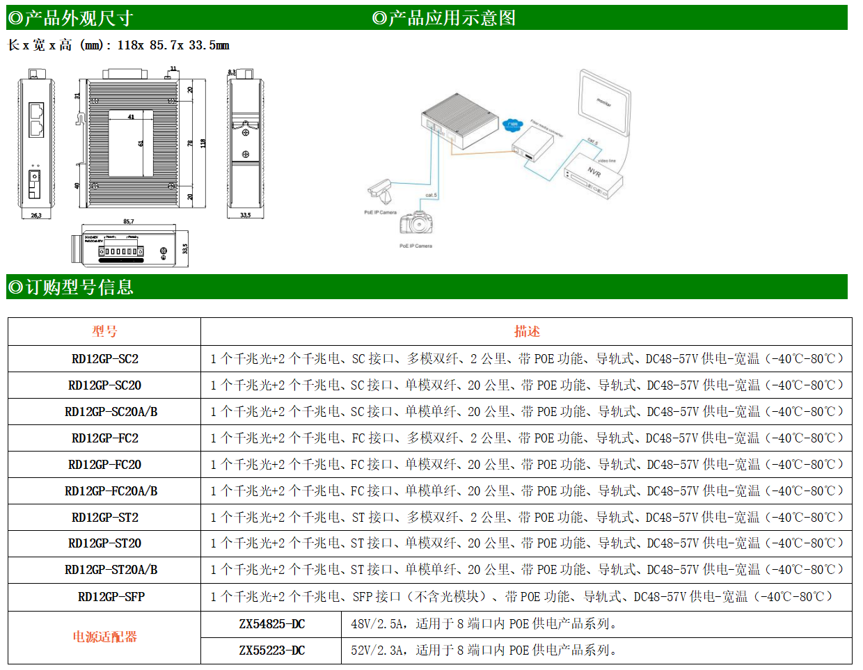 2路千兆POE電口+1路千兆FX光口工業(yè)級以太網(wǎng)POE交換機,支持2個10/100/1000Base-TX電口和1個1000Base-X光口。產(chǎn)品符合FCC、CE、ROHS標準。RD12GP系列交換機具有-40℃~80℃的工作溫度,具有超強的堅固度能適應各種嚴苛環(huán)境,也可以非常方便的安置在空間緊湊的控制箱中。導軌的安裝特性、寬溫操作及擁有IP40防護等級的外殼及LED指示燈,使RD12GP成為一個即插即用的工業(yè)級設備,為用戶的以太網(wǎng)設備聯(lián)網(wǎng)提供可靠、便捷的解決方案。