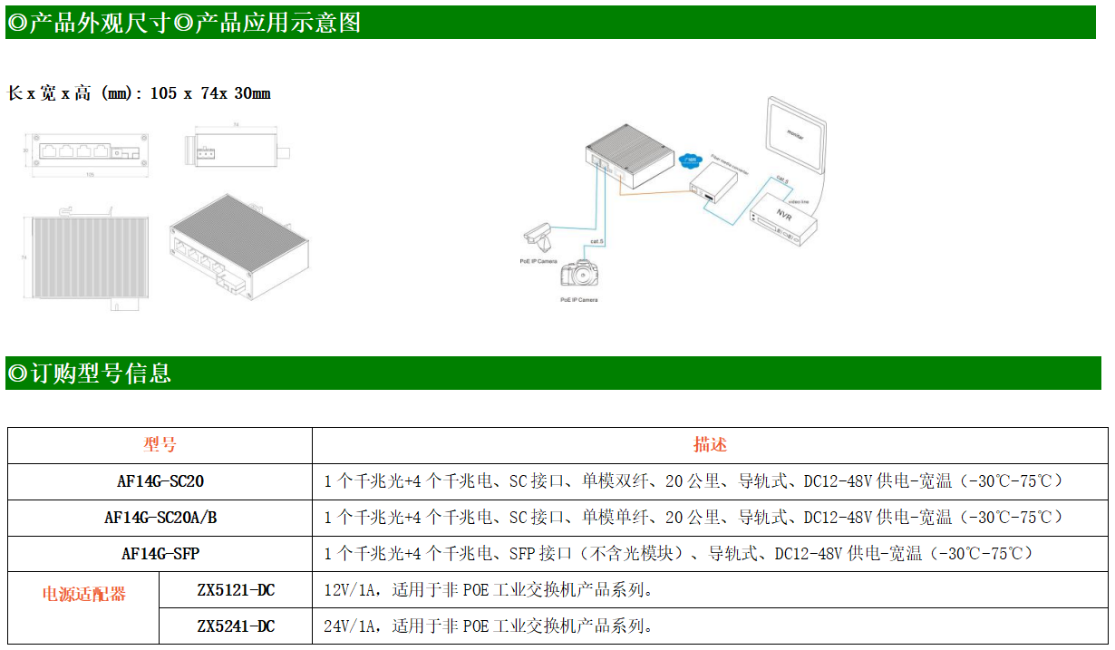 4路千兆電口+1路千兆FX光口工業級以太網交換機,支持4個100Base-T/1000Base-TX電口和1個1000Base-X光口。產品符合FCC、CE、ROHS標準。AF14G系列交換機具有-30℃~75℃的工作溫度,具有超強的堅固度能適應各種嚴苛環境,也可以非常方便的安置在空間緊湊的控制箱中。導軌的安裝特性、寬溫操作及擁有IP40防護等級的外殼及LED指示燈,使AF14G成為一個即插即用的工業級設備,為用戶的以太網設備聯網提供可靠、便捷的解決方案。