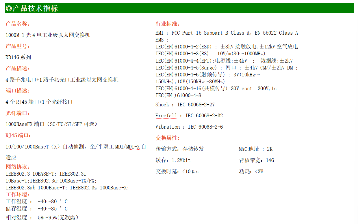 4路千兆POE電口+1路千兆FX光口工業級以太網POE交換機,支持4個10/100/1000Base-TX電口和1個1000Base-X光口。產品符合FCC、CE、ROHS標準。RD14GP系列交換機具有-40℃~80℃的工作溫度,具有超強的堅固度能適應各種嚴苛環境,也可以非常方便的安置在空間緊湊的控制箱中。導軌的安裝特性、寬溫操作及擁有IP40防護等級的外殼及LED指示燈,使RD14GP成為一個即插即用的工業級設備,為用戶的以太網設備聯網提供可靠、便捷的解決方案。
