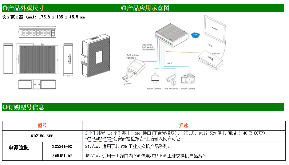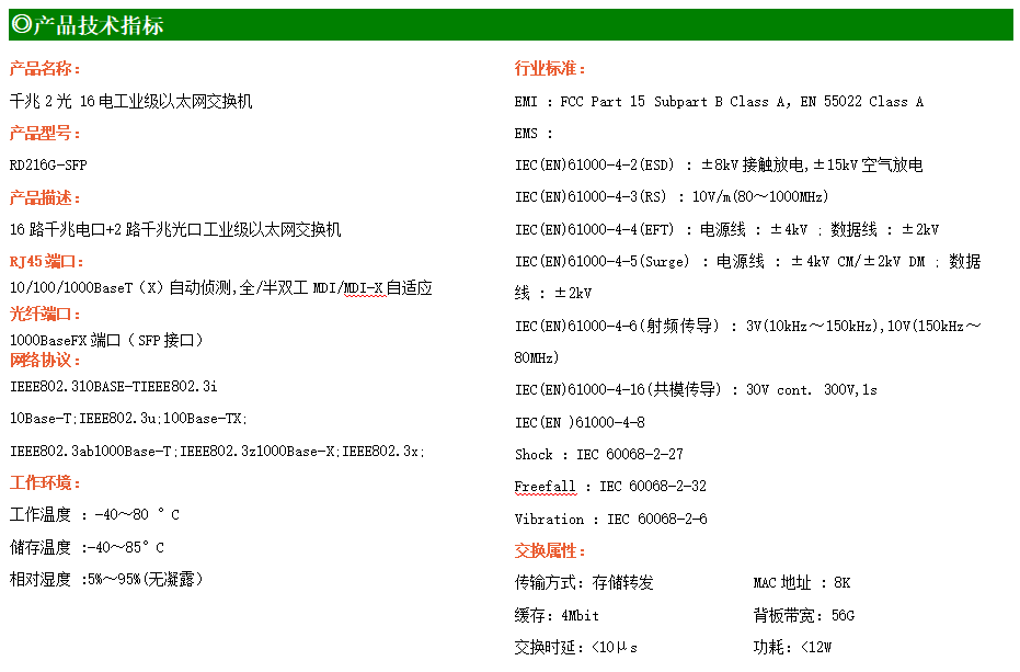 RD216G-SFP工業級以太網交換機,支持16個10Base-T/100Base-T/1000Base-TX電口和2個1000Base-X光口。產品符合FCC、CE、ROHS標準。RD216G-SFP交換機具有-40℃~80℃的工作溫度,具有超強的堅固度能適應各種嚴苛環境,也可以非常方便的安置在空間緊湊的控制箱中。導軌的安裝特性、寬溫操作及擁有IP40防護等級的外殼及LED指示燈,使RD216G-SFP成為一個即插即用的工業級設備,為用戶的以太網設備聯網提供可靠、便捷的解決方案。