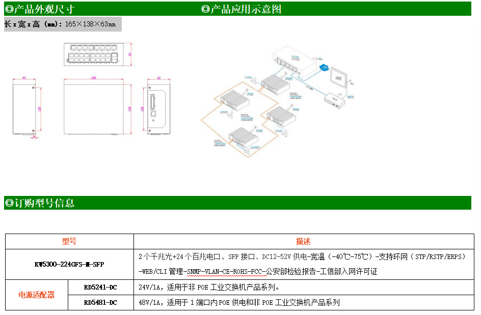 KW5300-224GFS-M是網管型工業以太網交換機,產品符合FCC、CE、RoHS標準。支持2個千兆光口和24個百兆電口;支持工業現場所需的以太網二層協議,保證通信網絡的穩定性;該系列交換機采用低功耗、無風扇設計,確保無噪聲干擾,同時支持-40~75℃工作溫度和良好的EMC電磁兼容性能,保證在惡劣的工業環境中保持穩定的工作,為工廠自動化,智能交通,視頻監控等工業應用領域組建快速穩定的網絡終端接入網絡提供安全可靠的解決方案。