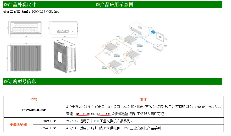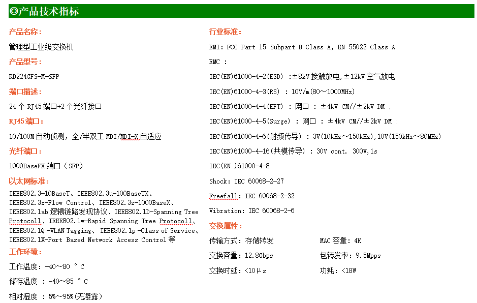 RD224GFS-M是網(wǎng)管型工業(yè)以太網(wǎng)交換機(jī),產(chǎn)品符合FCC、CE、RoHS標(biāo)準(zhǔn)。支持2個千兆光口和24個百兆電口;支持工業(yè)現(xiàn)場所需的以太網(wǎng)二層協(xié)議,保證通信網(wǎng)絡(luò)的穩(wěn)定性;該系列交換機(jī)采用低功耗、無風(fēng)扇設(shè)計,確保無噪聲干擾,同時支持-40~80℃工作溫度和良好的EMC電磁兼容性能,保證在惡劣的工業(yè)環(huán)境中保持穩(wěn)定的工作,為工廠自動化,智能交通,視頻監(jiān)控等工業(yè)應(yīng)用領(lǐng)域組建快速穩(wěn)定的網(wǎng)絡(luò)終端接入網(wǎng)絡(luò)提供安全可靠的解決方案。