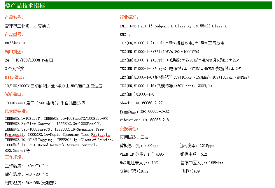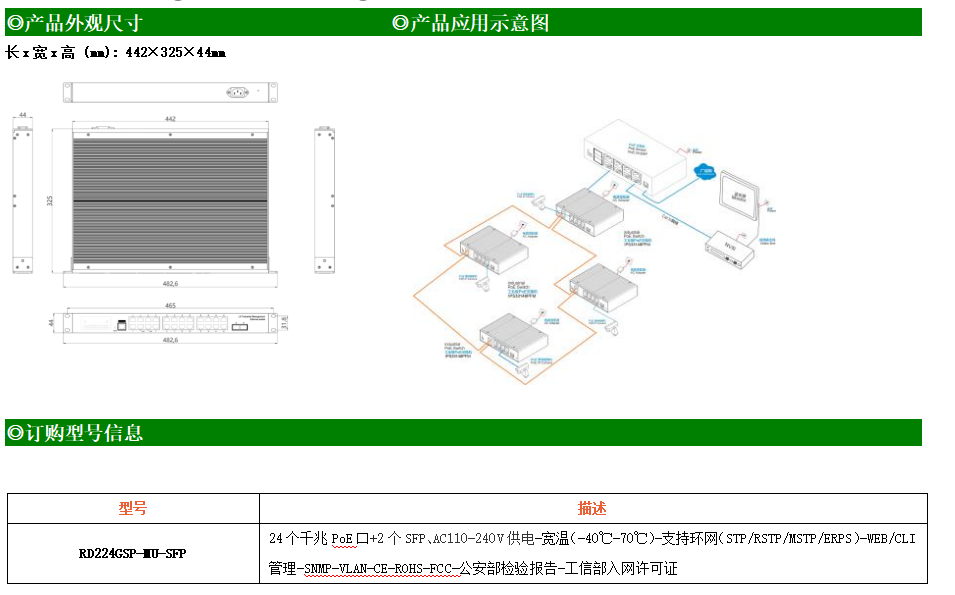 RD224GSP-MU-SFP是網管型工業以太網PoE交換機,產品符合FCC、CE、RoHS標準??商峁?4個千兆PoE端口,所有PoE端口符合IEEE802.3af/at標準。支持工業現場所需的以太網二層協議,保證通信網絡的穩定性;該系列交換機采用低功耗、無風扇設計,確保無噪聲干擾,同時支持-40~70℃工作溫度和良好的EMC電磁兼容性能,保證在惡劣的工業環境中保持穩定的工作,為工廠自動化,智能交通,視頻監控等工業應用領域組建快速穩定的網絡終端接入網絡提供安全可靠的解決方案。