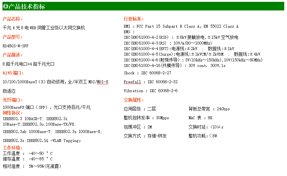 RD48GS-W-SFP系列WEB網(wǎng)管工業(yè)級以太網(wǎng)交換機,產(chǎn)品符合FCC、CE、ROHS標準,支持工業(yè)現(xiàn)場所需的以太網(wǎng)二層協(xié)議,保證通信網(wǎng)絡(luò)的穩(wěn)定性。該系列交換機采用低功耗、無風扇設(shè)計,確保無噪聲干擾,同時支持-40~80℃工作溫度和良好的EMC電磁兼容性能,保證在惡劣的工業(yè)環(huán)境中保持穩(wěn)定的工作,為工廠自動化,智能交通,視頻監(jiān)控等工業(yè)應(yīng)用領(lǐng)域組建快速穩(wěn)定的網(wǎng)絡(luò)終端接入網(wǎng)絡(luò)提供安全可靠的解決方案。