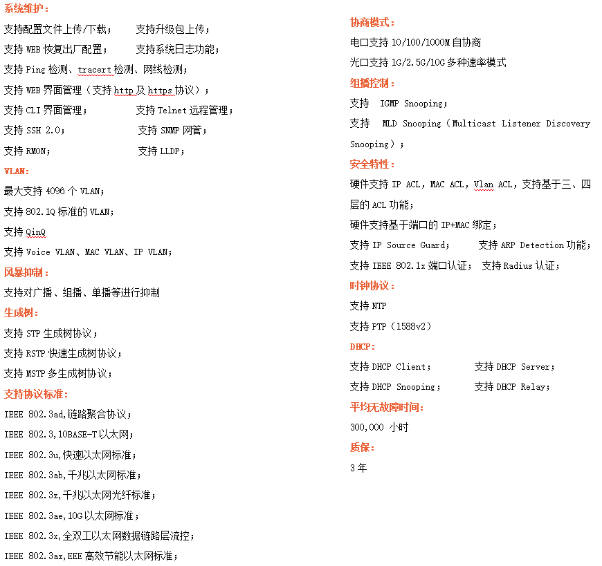 ●網絡冗余:支持STP/RSTP/MSTP,支持ERPS(自愈時間<20ms)