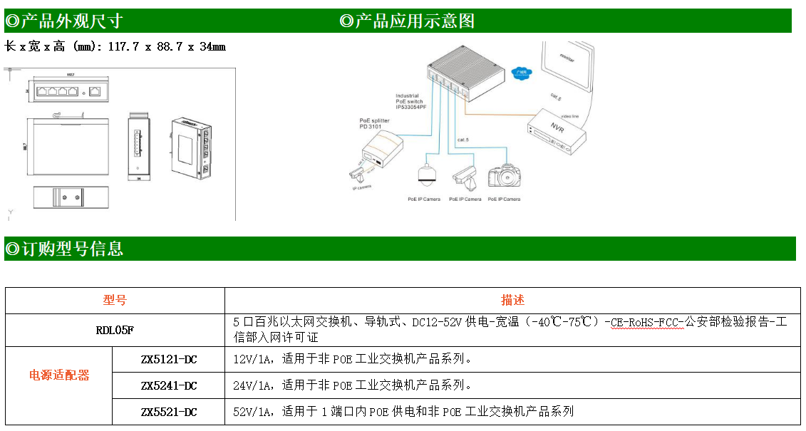 1路百兆上聯(lián)電口+4路百兆下聯(lián)電口工業(yè)級以太網(wǎng)交換機,支持1個10/100Base-TX上聯(lián)電口和4個10Base-T/100Base-TX下聯(lián)電口。產(chǎn)品符合FCC、CE、ROHS標準。RDL05F交換機具有-40℃~75℃的工作溫度,具有超強的堅固度能適應各種嚴苛環(huán)境,也可以非常方便的安置在空間緊湊的控制箱中。導軌的安裝特性、寬溫操作及擁有IP40防護等級的外殼及LED指示燈,使RDL05F成為一個即插即用的工業(yè)級設備,為用戶的以太網(wǎng)設備聯(lián)網(wǎng)提供可靠、便捷的解決方案。
