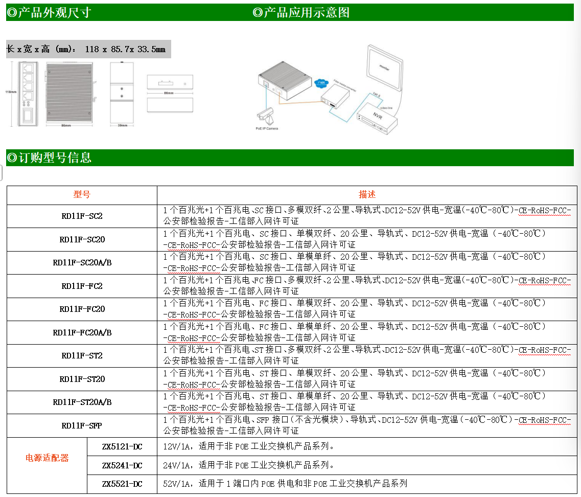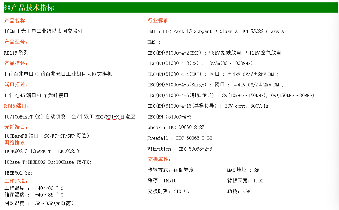 1路百兆電口+1路百兆FX光口工業(yè)級以太網(wǎng)交換機,支持1個10Base-T/100Base-TX電口和1個100Base-X光口。產(chǎn)品符合FCC、CE、ROHS標準。RD11F系列交換機具有-40℃~80℃的工作溫度,具有超強的堅固度能適應(yīng)各種嚴苛環(huán)境,也可以非常方便的安置在空間緊湊的控制箱中。導(dǎo)軌的安裝特性、寬溫操作及擁有IP40防護等級的外殼及LED指示燈,使RD11F成為一個即插即用的工業(yè)級設(shè)備,為用戶的以太網(wǎng)設(shè)備聯(lián)網(wǎng)提供可靠、便捷的解決方案。
