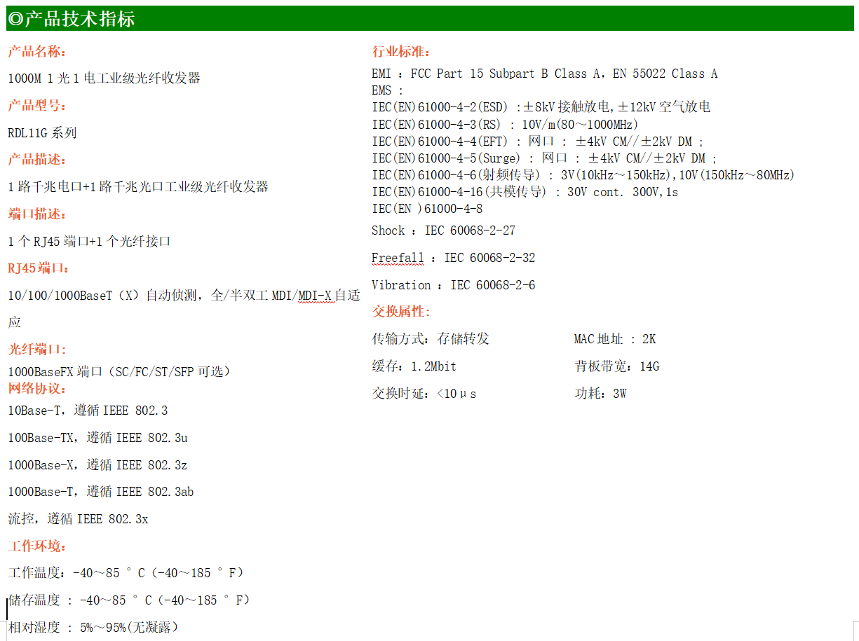 1路千兆電口+1路千兆FX光口工業(yè)級(jí)以太網(wǎng)交換機(jī),支持1個(gè)10Base-T/100Base-T/1000Base-TX電口和1個(gè)1000Base-X光口。產(chǎn)品符合FCC、CE、ROHS標(biāo)準(zhǔn)。RDL11G系列交換機(jī)具有-40℃~75℃的工作溫度,具有超強(qiáng)的堅(jiān)固度能適應(yīng)各種嚴(yán)苛環(huán)境,也可以非常方便的安置在空間緊湊的控制箱中。導(dǎo)軌的安裝特性、寬溫操作及擁有IP40防護(hù)等級(jí)的外殼及LED指示燈,使RDL11G成為一個(gè)即插即用的工業(yè)級(jí)設(shè)備,為用戶的以太網(wǎng)設(shè)備聯(lián)網(wǎng)提供可靠、便捷的解決方案。
