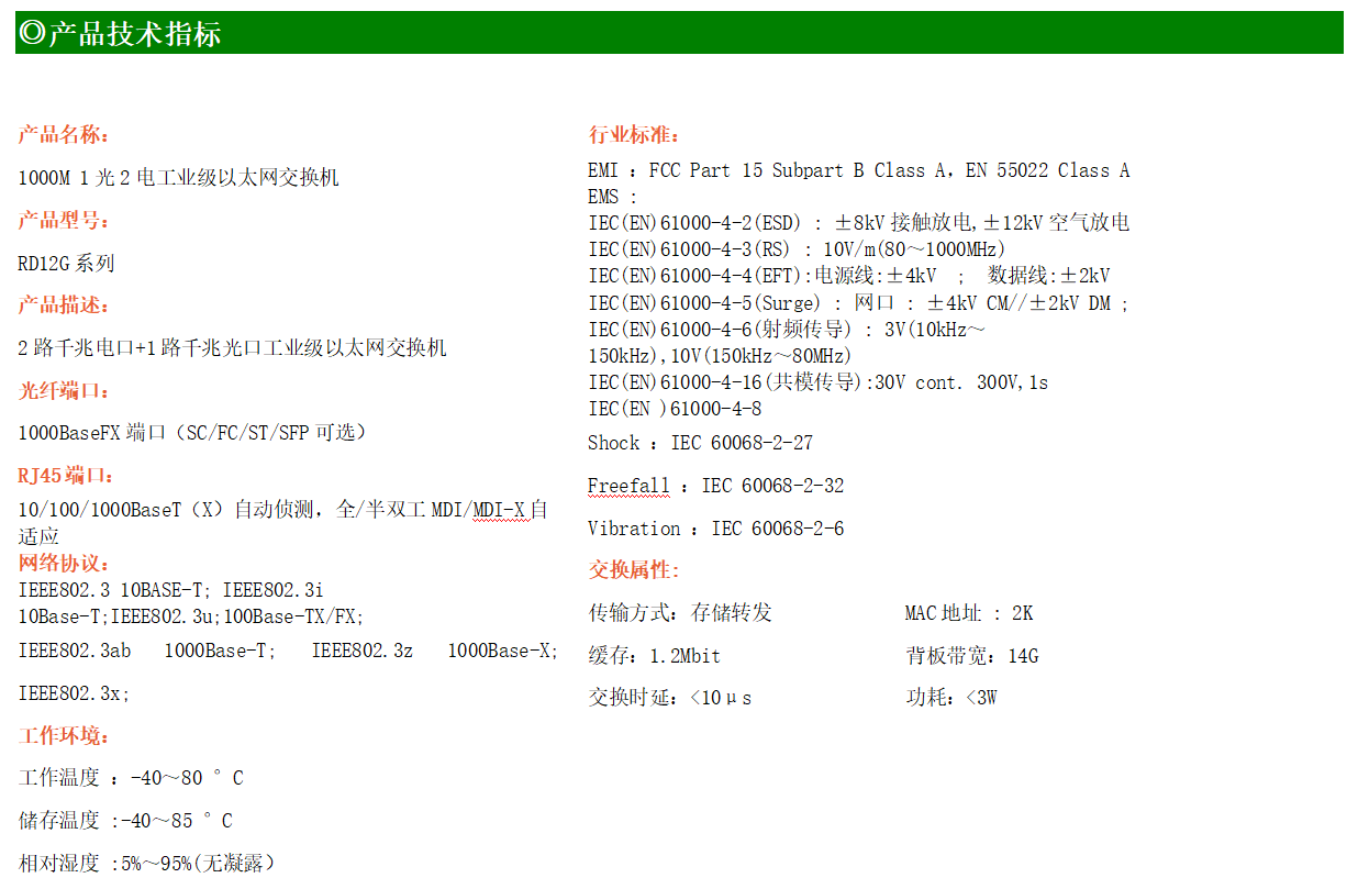 2路千兆電口+1路千兆FX光口工業(yè)級以太網(wǎng)交換機,支持2個100Base-T/1000Base-TX電口和1個1000Base-X光口。產(chǎn)品符合FCC、CE、ROHS標(biāo)準(zhǔn)。RD12G系列交換機具有-40℃~80℃的工作溫度,具有超強的堅固度能適應(yīng)各種嚴(yán)苛環(huán)境,也可以非常方便的安置在空間緊湊的控制箱中。導(dǎo)軌的安裝特性、寬溫操作及擁有IP40防護(hù)等級的外殼及LED指示燈,使YHD12G成為一個即插即用的工業(yè)級設(shè)備,為用戶的以太網(wǎng)設(shè)備聯(lián)網(wǎng)提供可靠、便捷的解決方案。