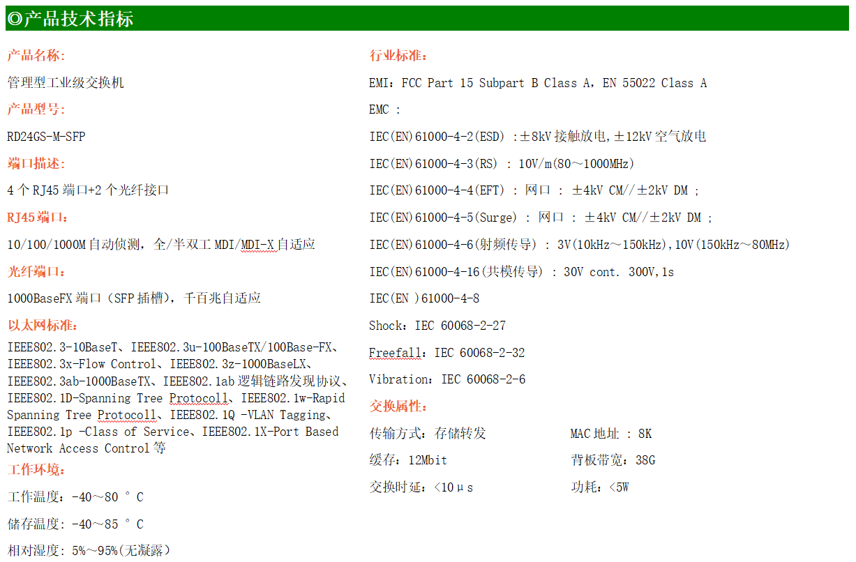 RD24GS-M是網(wǎng)管型工業(yè)以太網(wǎng)交換機(jī),產(chǎn)品符合FCC、CE、RoHS標(biāo)準(zhǔn)。支持2個千兆光口和4個千兆電口;支持工業(yè)現(xiàn)場所需的以太網(wǎng)二層協(xié)議,保證通信網(wǎng)絡(luò)的穩(wěn)定性;該系列交換機(jī)采用低功耗、無風(fēng)扇設(shè)計,確保無噪聲干擾,同時支持-40~80℃工作溫度和良好的EMC電磁兼容性能,保證在惡劣的工業(yè)環(huán)境中保持穩(wěn)定的工作,為工廠自動化,智能交通,視頻監(jiān)控等工業(yè)應(yīng)用領(lǐng)域組建快速穩(wěn)定的網(wǎng)絡(luò)終端接入網(wǎng)絡(luò)提供安全可靠的解決方案。