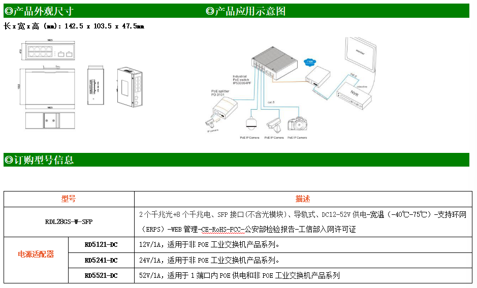 RDL28GS-W-SFP系列WEB網管工業級以太網交換機,產品符合FCC、CE、ROHS標準,支持工業現場所需的以太網二層協議,保證通信網絡的穩定性。該系列交換機采用低功耗、無風扇設計,確保無噪聲干擾,同時支持-40~75℃工作溫度和良好的EMC電磁兼容性能,保證在惡劣的工業環境中保持穩定的工作,為工廠自動化,智能交通,視頻監控等工業應用領域組建快速穩定的網絡終端接入網絡提供安全可靠的解決方案。