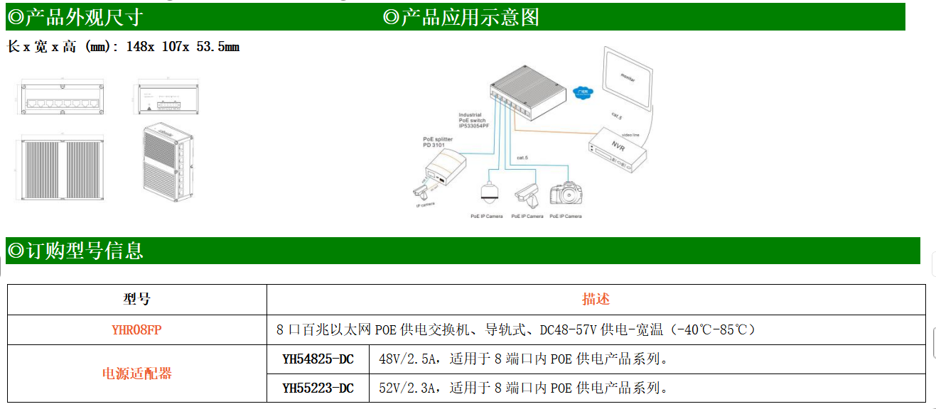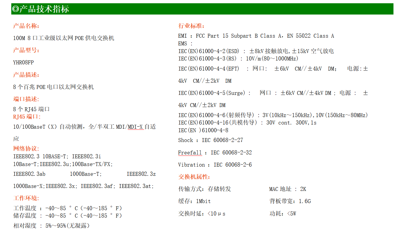 8路百兆電口工業(yè)級以太網(wǎng)交換機,支持8個10Base-T/100Base-TX POE電口。產(chǎn)品符合FCC、CE、ROHS標準。YHR08FP交換機具有-40℃~85℃的工作溫度,具有超強的堅固度能適應(yīng)各種嚴苛環(huán)境,也可以非常方便的安置在空間緊湊的控制箱中。導(dǎo)軌的安裝特性、寬溫操作及擁有IP40防護等級的外殼及LED指示燈,使YH200-08FP成為一個即插即用的工業(yè)級設(shè)備,為用戶的以太網(wǎng)設(shè)備聯(lián)網(wǎng)提供可靠、便捷的解決方案。