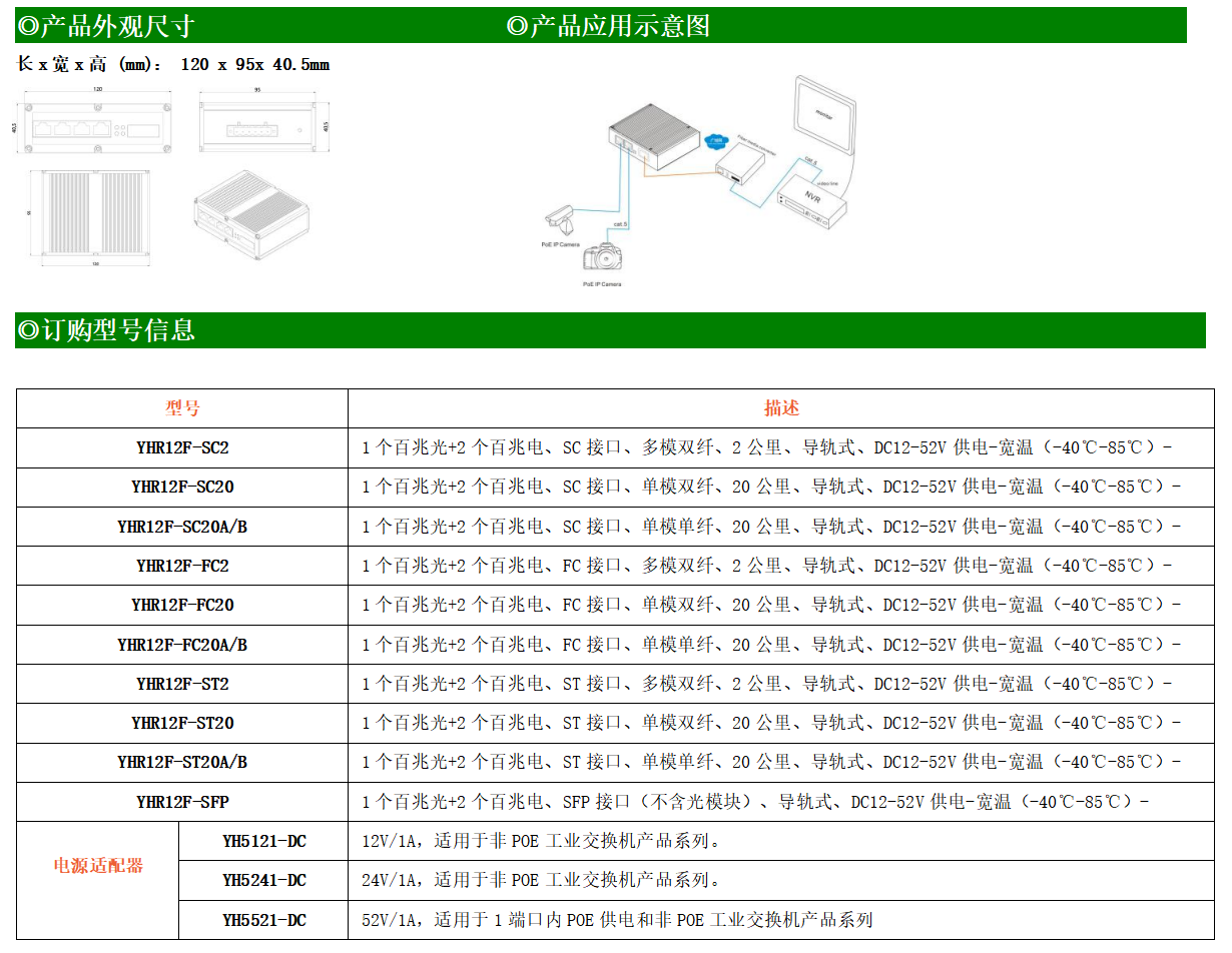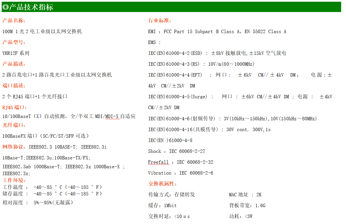 2路百兆電口+1路百兆FX光口工業(yè)級以太網(wǎng)交換機,支持2個10Base-T/100Base-TX電口和1個100Base-X光口。產(chǎn)品符合FCC、CE、ROHS標(biāo)準(zhǔn)。YHR12F系列交換機具有-40℃~85℃的工作溫度,具有超強的堅固度能適應(yīng)各種嚴(yán)苛環(huán)境,也可以非常方便的安置在空間緊湊的控制箱中。導(dǎo)軌的安裝特性、寬溫操作及擁有IP40防護等級的外殼及LED指示燈,使YH200-12F成為一個即插即用的工業(yè)級設(shè)備,為用戶的以太網(wǎng)設(shè)備聯(lián)網(wǎng)提供可靠、便捷的解決方案。