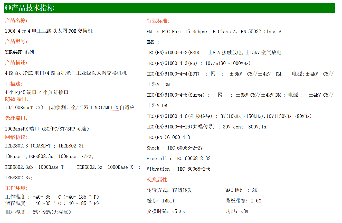 4路百兆POE電口+4路百兆FX光口工業級以太網交換機,支持4個10Base-T/100Base-TX電口和4個100Base-X光口。產品符合FCC、CE、ROHS標準。YH200-44FP系列交換機具有-40℃~85℃的工作溫度,具有超強的堅固度能適應各種嚴苛環境,也可以非常方便的安置在空間緊湊的控制箱中。導軌的安裝特性、寬溫操作及擁有IP40防護等級的外殼及LED指示燈,使YH200-44FP成為一個即插即用的工業級設備,為用戶的以太網設備聯網提供可靠、便捷的解決方案。