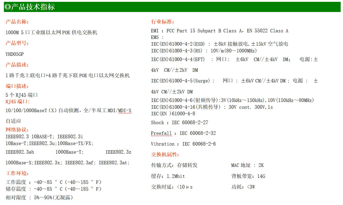 1路千兆上聯(lián)電口+4路千兆下聯(lián)電口工業(yè)級以太網(wǎng)POE交換機(jī),支持1個(gè)10/100/1000Base-TX上聯(lián)電口和4個(gè)100Base-T/1000Base-TX下聯(lián)POE電口。產(chǎn)品符合FCC、CE、ROHS標(biāo)準(zhǔn)。YH300-05GP交換機(jī)具有-40℃~85℃的工作溫度,具有超強(qiáng)的堅(jiān)固度能適應(yīng)各種嚴(yán)苛環(huán)境,也可以非常方便的安置在空間緊湊的控制箱中。導(dǎo)軌的安裝特性、寬溫操作及擁有IP40防護(hù)等級的外殼及LED指示燈,使YH300-05GP成為一個(gè)即插即用的工業(yè)級設(shè)備,為用戶的以太網(wǎng)設(shè)備聯(lián)網(wǎng)提供可靠、便捷的解決方案。
