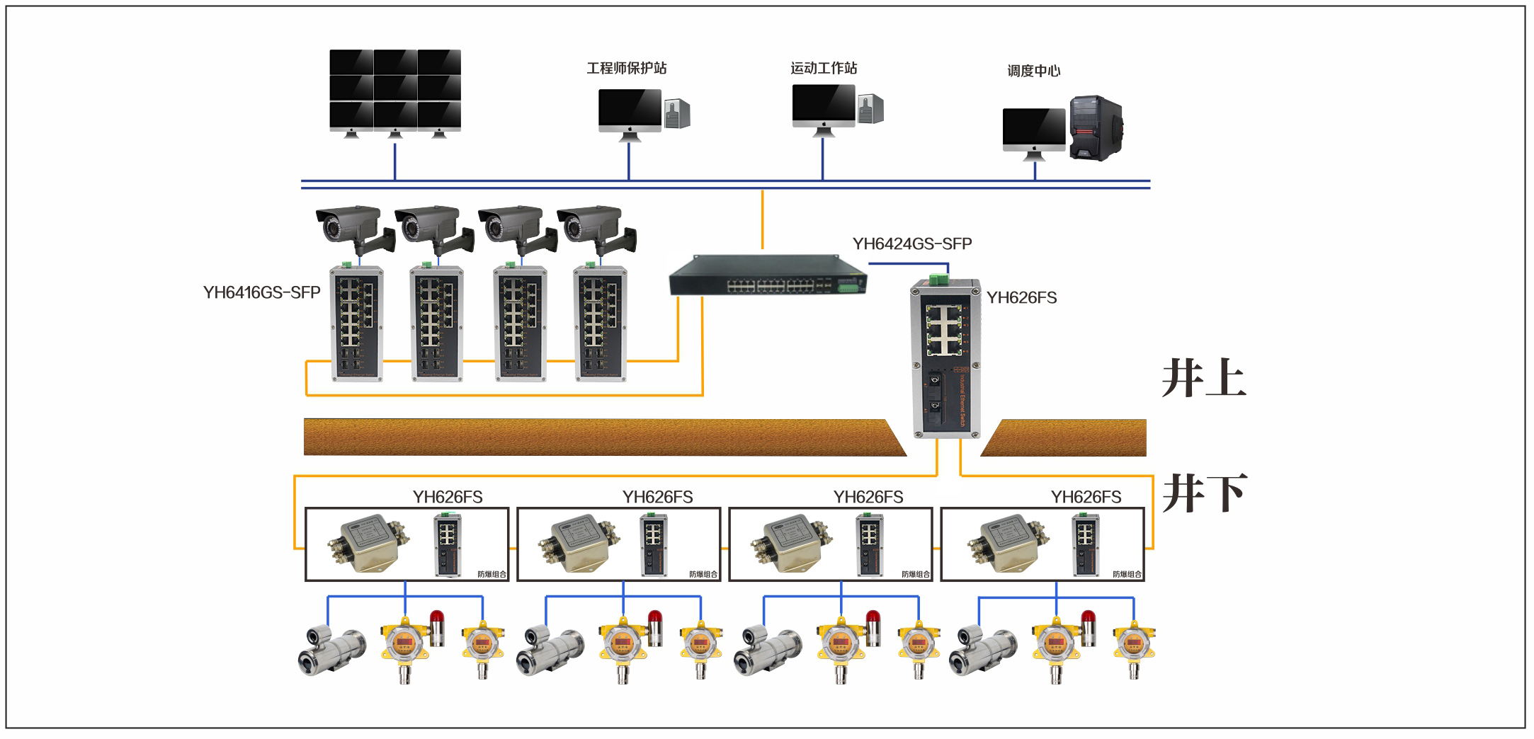 宇航在礦井網絡監控系統解決方案中采用了YH6424GS-SFP,YH626FS,YH6416GS-SFP,YH628GSP-SFP礦井現場環境比較惡劣,在震動、濕氣、溫度上都要比普通環境惡劣。故建議用宇航工業級交換機產品連接工業網絡。在必要安裝的監控點,安裝攝像機和防爆器等設備。確保實時監測與監控現場的環境情況,確保現場安全。