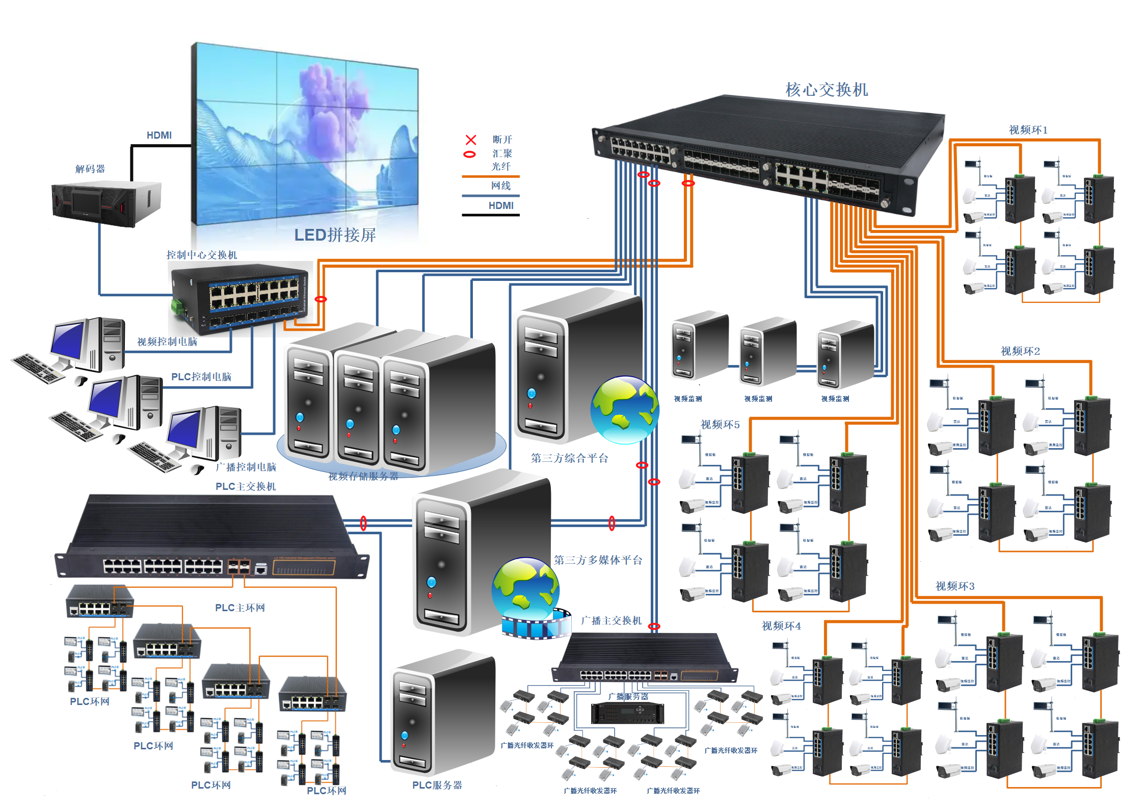 2、多系統融合管理:將PLC控制、視頻監控、廣播通信、環境監測等多個子系統接入網絡系統,實現集中監控和統一調度管理。